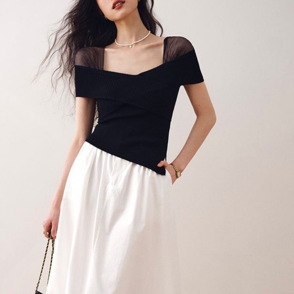 シフォンアクセントクロスニットトップス