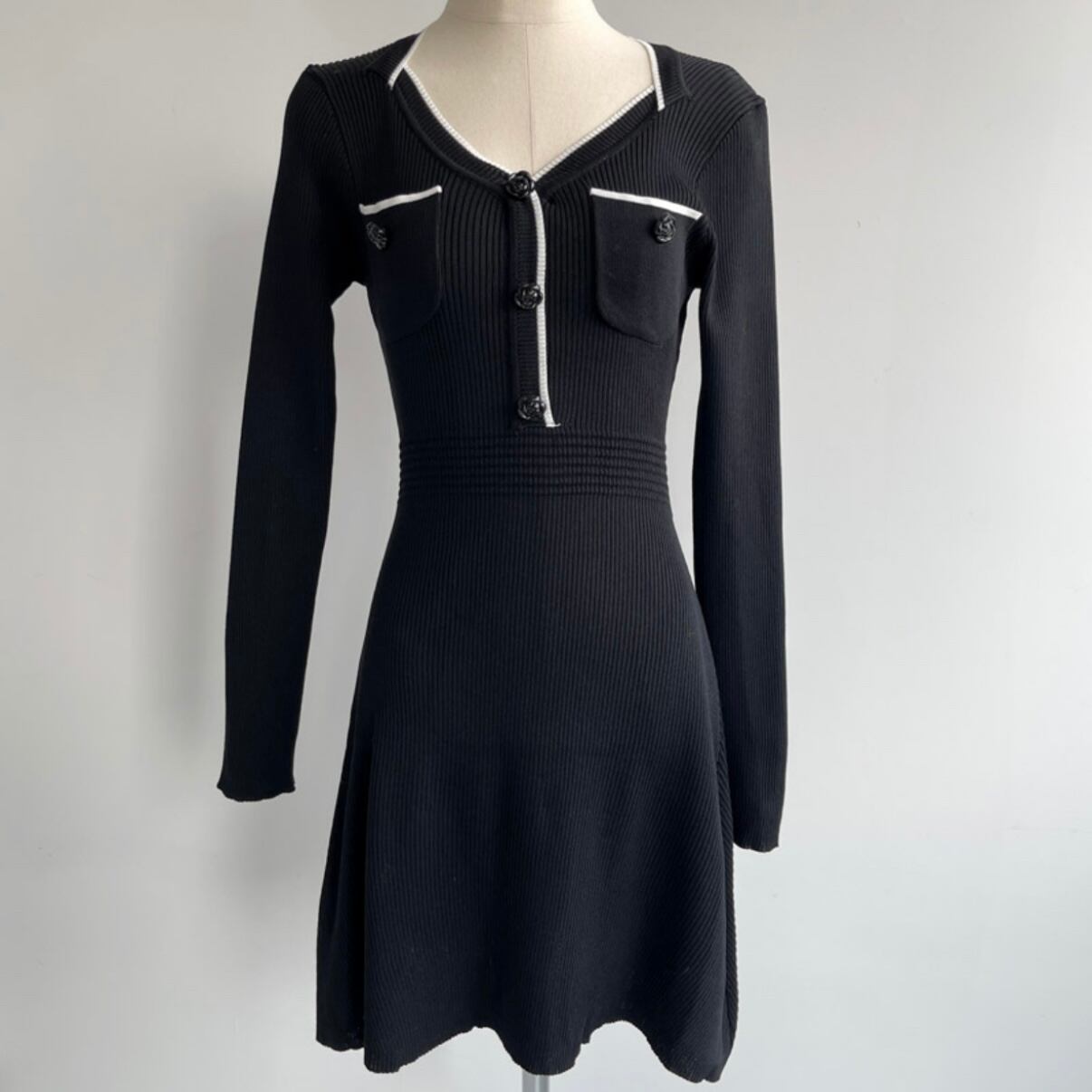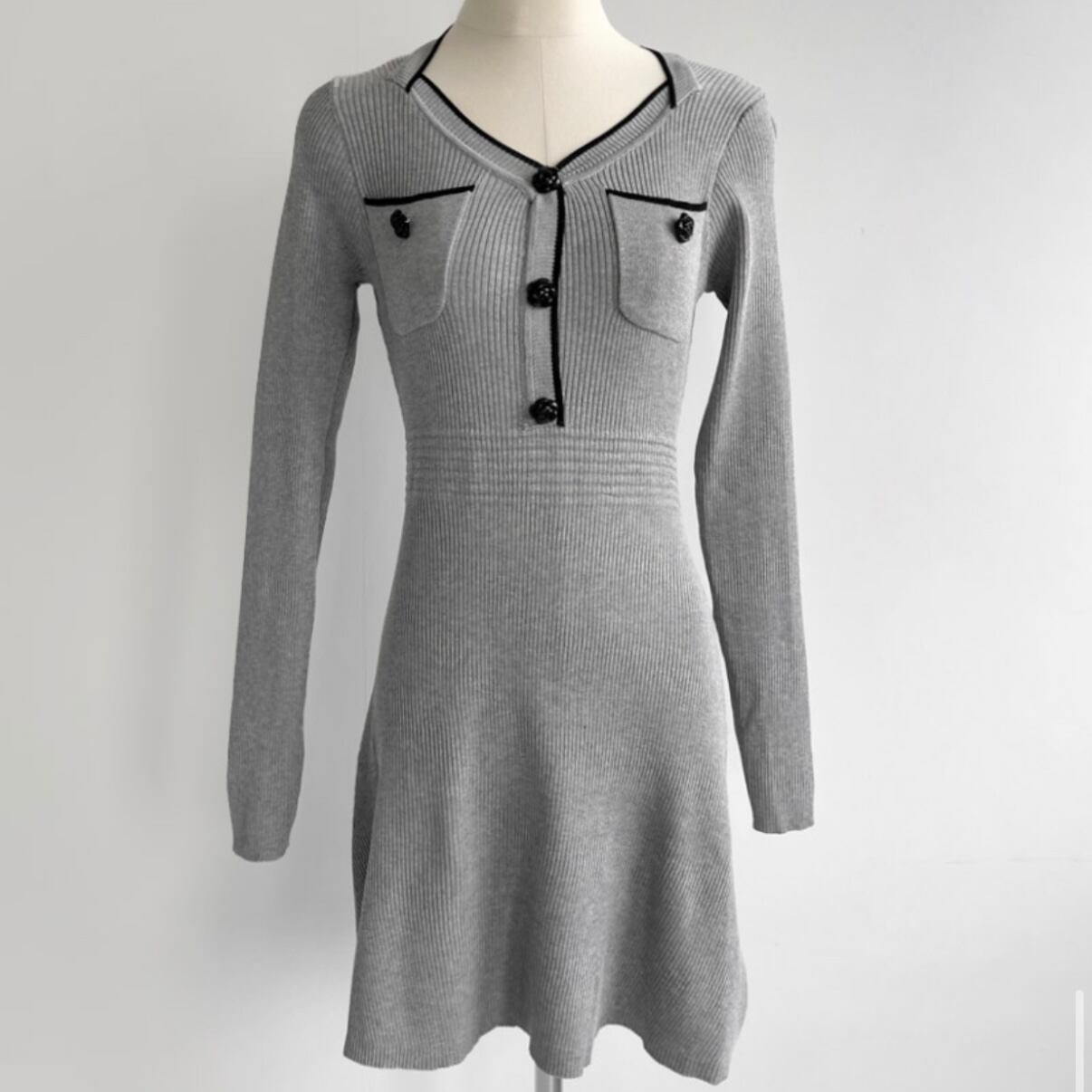 バイカラーダイヤネックフラワーボタンニットワンピース