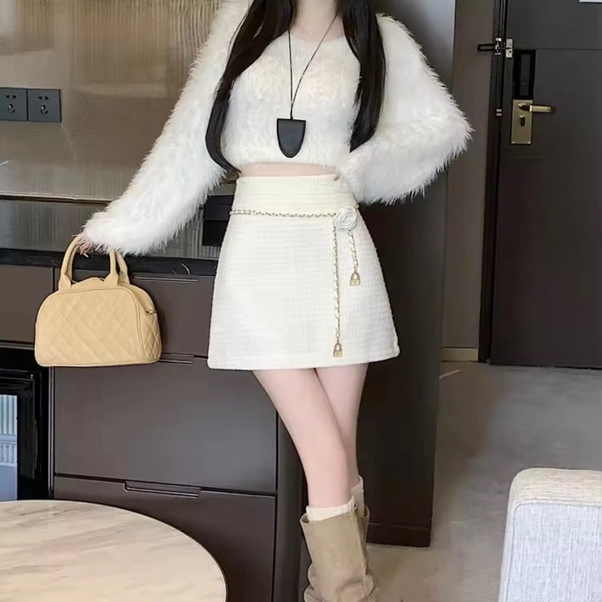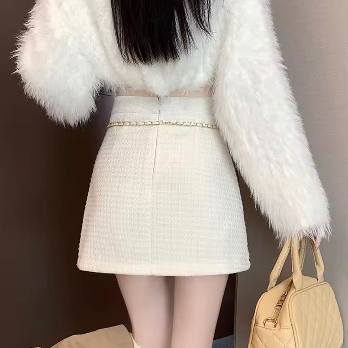 ツイードチェーンベルトブローチミニスカート