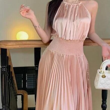 ロングプリーツノースリーブドレス[Pink]