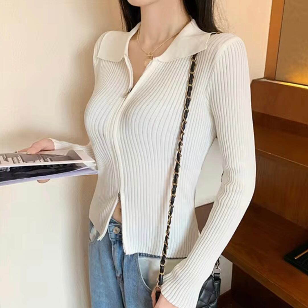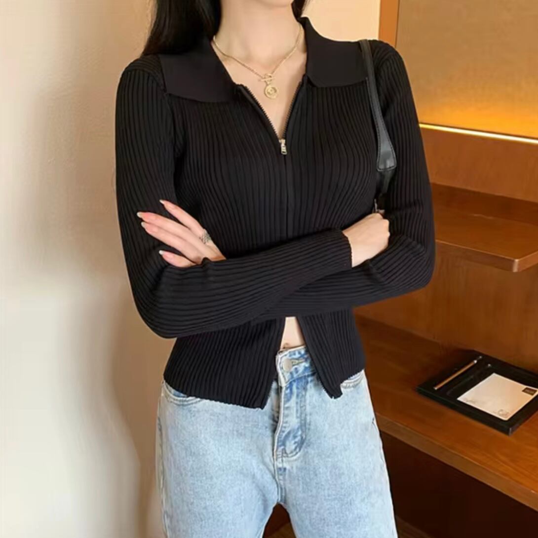 カラーネックリブジップニット