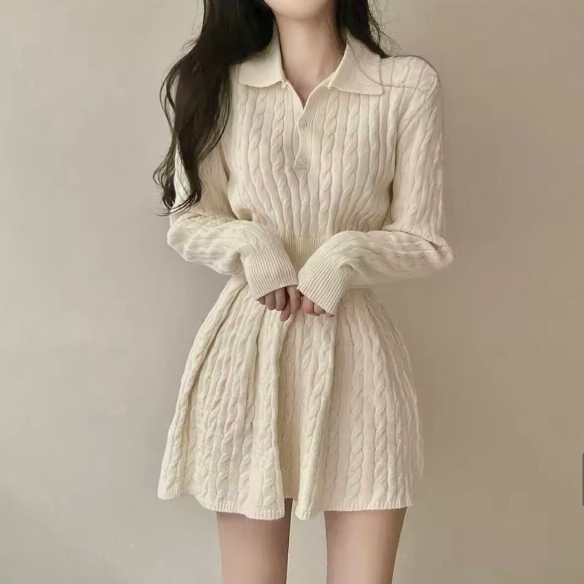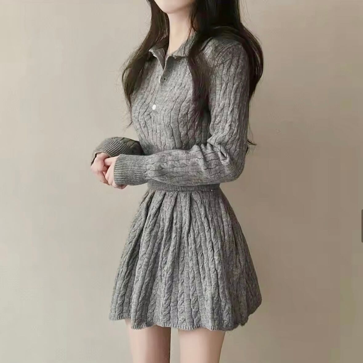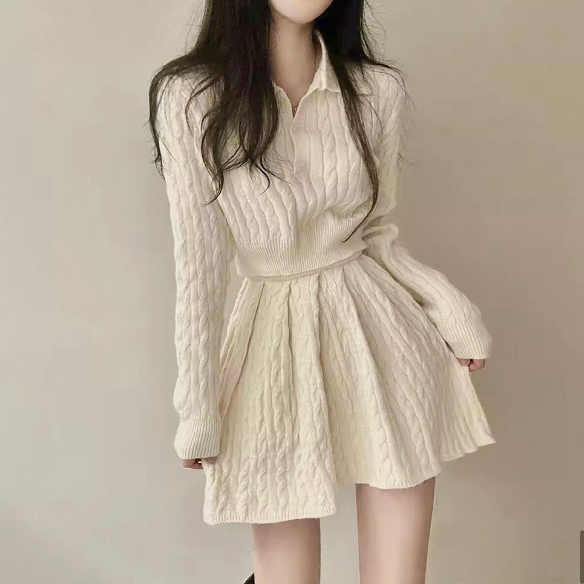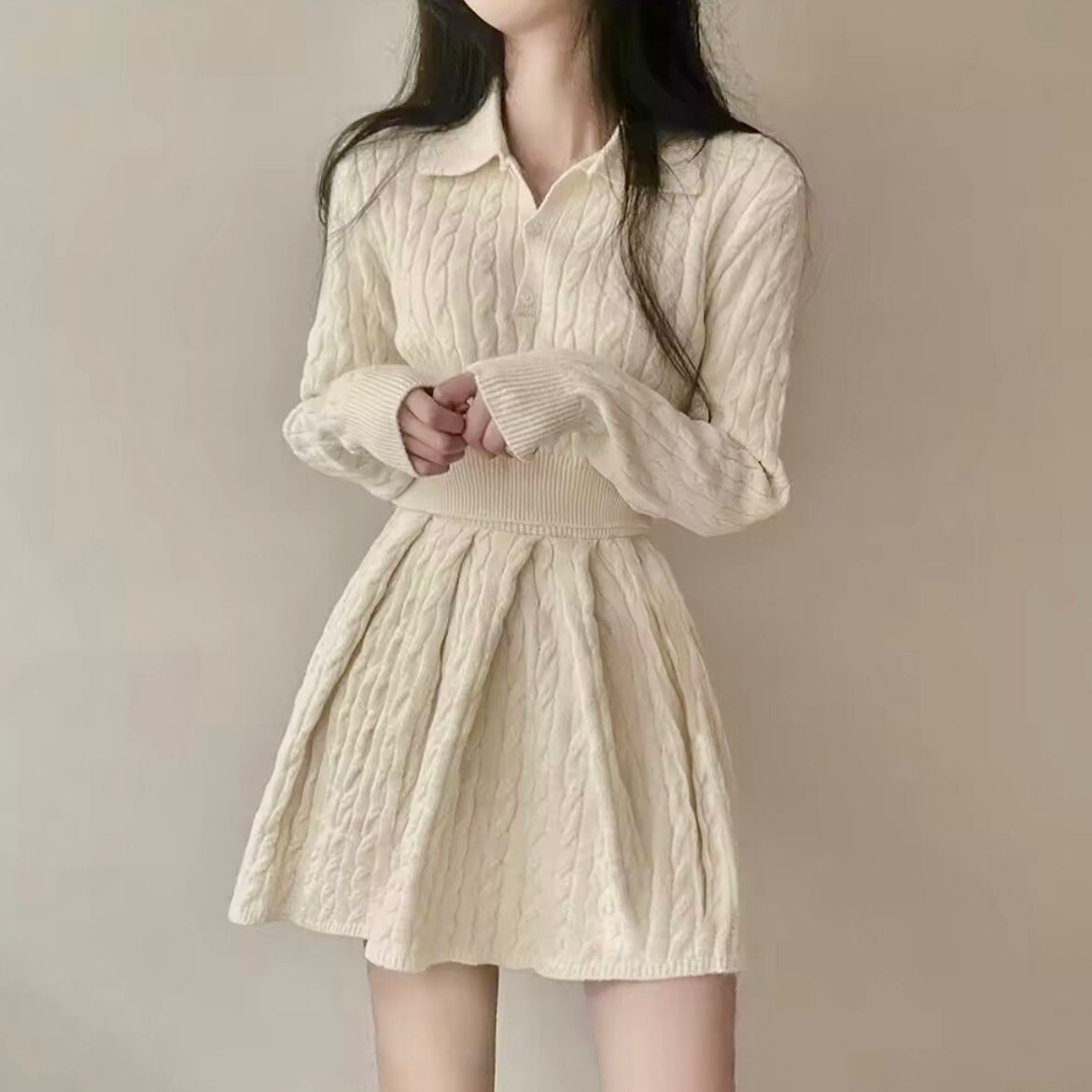 ポロカラーケーブルクロップドセットアップニット