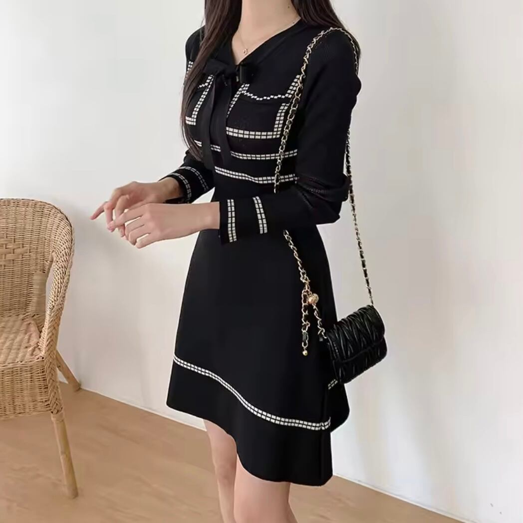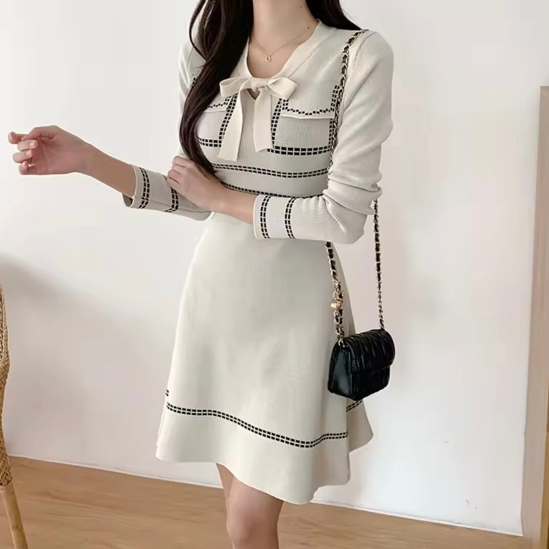 ステッチ風リボンニットワンピース