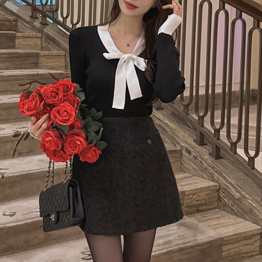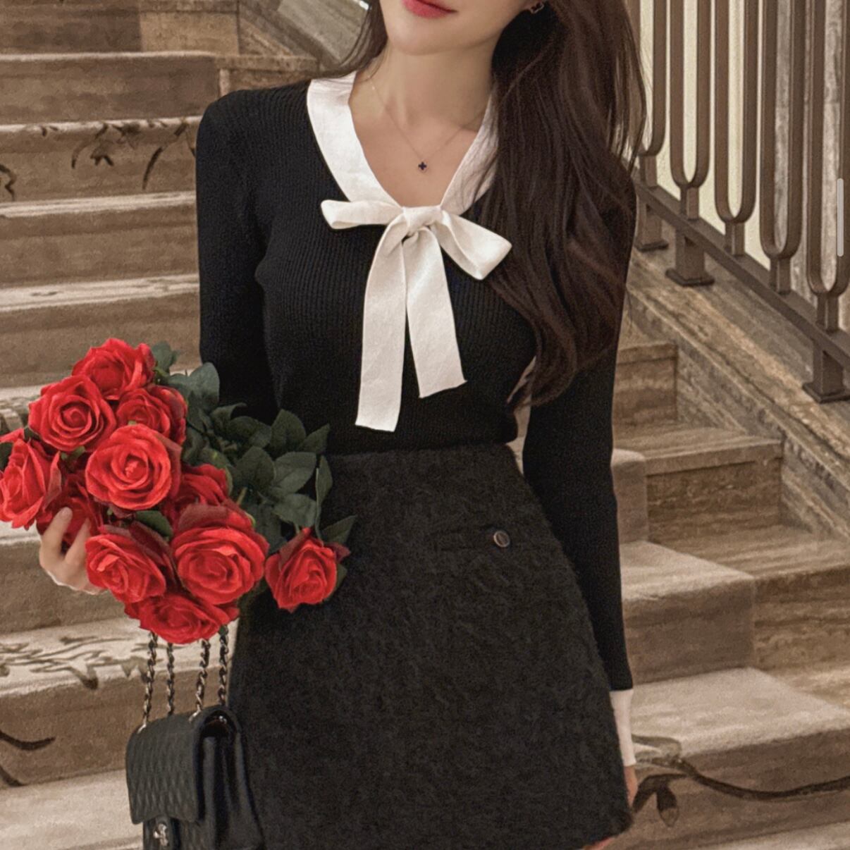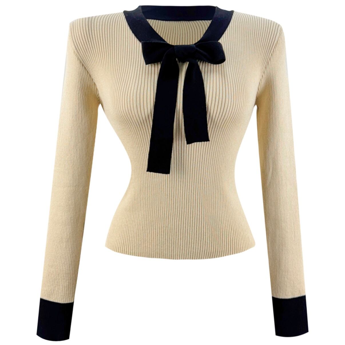 上品なラウンドネックに、カラー配色とリボンタイがアクセント♡